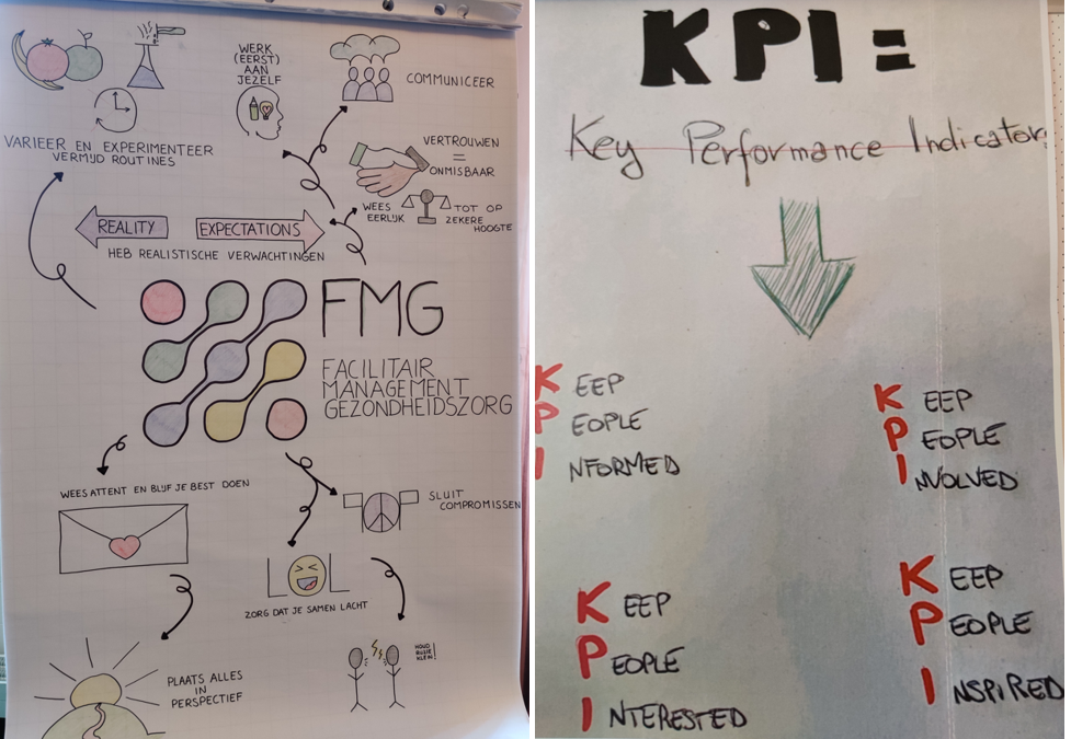Als gesprekshandleiding maakten ze gebruik van verschillende “relatietips”, mooi verbeeld op de linker tekening. Onderwerpen als “spreek je elkaars taal”, “is er een klik op normen en waarden” “wie is jouw contractbeheerder/relatiemanager (niet de inkoper)”. En hoe breng je de relatie “van jeuk naar leuk”.