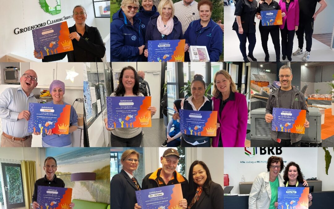 Gefeliciteerd, finalisten! De jury heeft in onderling overleg besloten wie de 10 finalisten zijn met een grote diversiteit op het podium: gezondheidszorg, leisure, transport, kantoor, onderwijs, evenementen en meer. De schoonmaaktoppers vertegenwoordigen 1 eigendienst, 1 klein schoonmaakbedrijf, 4 midden en 4 grote schoonmaakbedrijven. Het organisatieteam Esther van der Lelie en Petra de Bruin heeft de 10 uitblinkers door heel Nederland op 12 en 15 april spontaan verrast en verblijd met een oorkonde en taart. “Verrassend, blij, emotioneel reageerden Christina, Delfina, Fatma, Ghazi, Henk, Jan, Marianna, Martine, Nancy en Santa. Zij voelen zich vereerd en stralen op dinsdag 18 juni tijdens de verkiezingsfeest Let’s shine op het podium. Hoe bijzonder is dat! Zij zijn trots op hun vak, op zichzelf, maar ook hun familie, collega’s, werkgevers en opdrachtgevers zijn trots op hen.”
